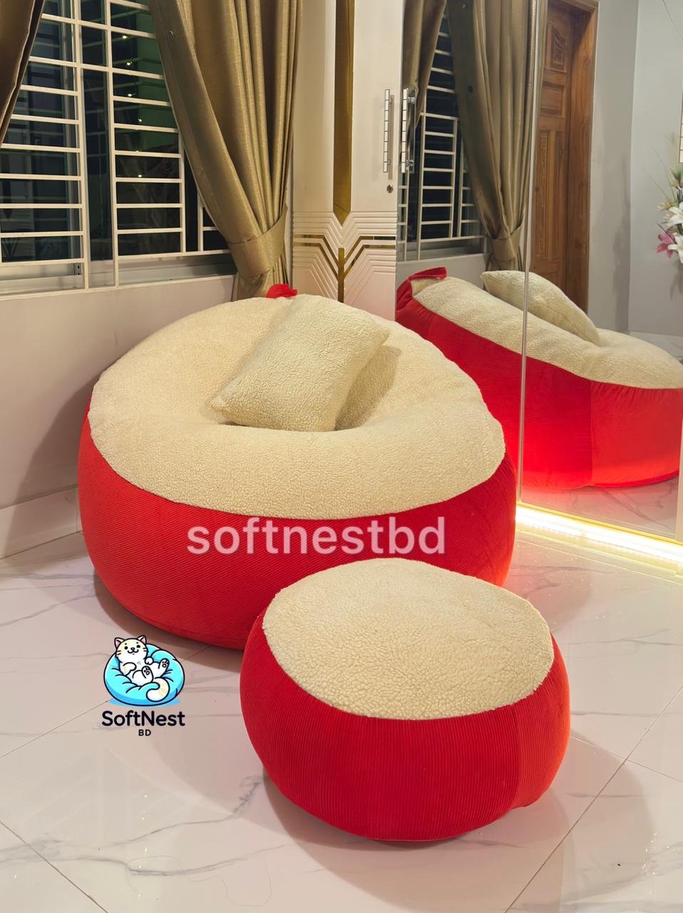 * ফিলার: বিন ব্যাগ এবং ফুট রেস্টের ভিতরে থাকবে প্রিমিয়াম কোয়ালিটি তাইওয়ানিজ ই,পি,এস বিনস এবং কুশনের ভিতরে থাকবে উন্নত মানের কোরিয়ান পলি ফাইবার তুলা।